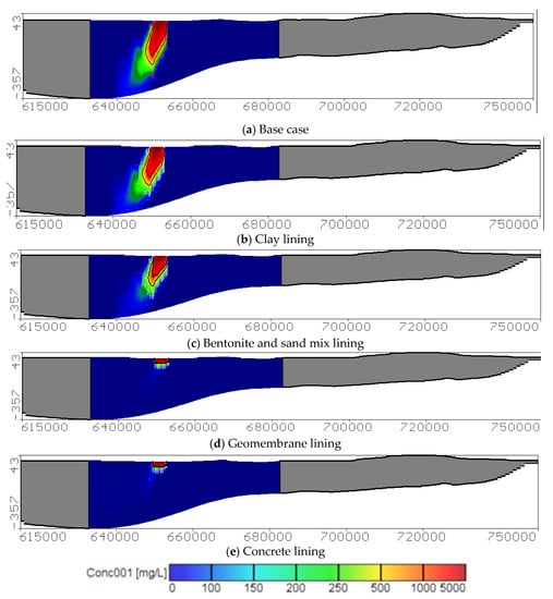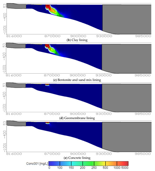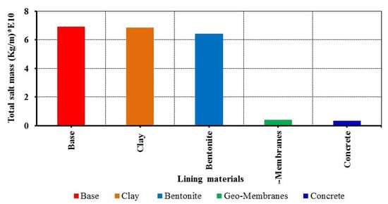Figure 13 presents the relation between the TDS values and different lining materials which indicates that aquifer contamination is decreased by lining the polluted streams of the BED. In addition, total salt mass decreased from 6.87 × 1010 in the base case to 6.409 × 1010, 3.969 × 109, and 3.440 × 109 kg using clay, bentonite, geomembrane, and concrete lining materials, respectively, as shown in Figure 13.