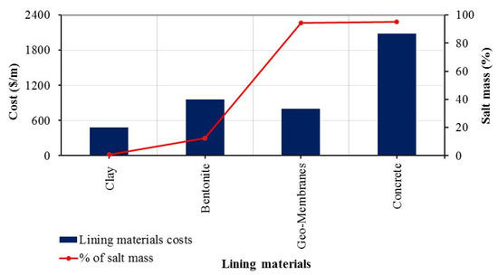 In the study, we also present the feasibility for using different lining materials. According to the market survey, the cost of the textured LDPE geomembrane ranges between 0.50 and 5 USD/m2 depending on properties and durability, the cost of concrete starts at 13 USD/m2 for 25 cm thickness, mixed bentonite with sand reaches 6 USD/m2, and clay is about 3 USD/m2. The estimated value of the wetted perimeter for the BED is 160 m and the calculated cost for each material is USD 480, 960, 800 and 2080 for clay, bentonite, geomembrane, and concrete, respectively. Figure 11 shows the relation between the cost for different lining materials and the reduction in percentage of salt mass in the aquifer.