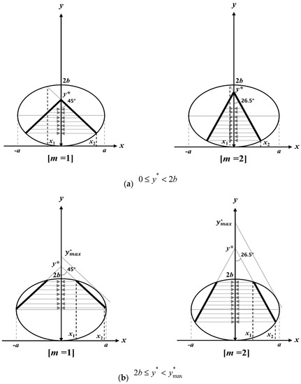 This study considered the raindrops reaching the surface of the elliptical basin evenly in space. When it comes to the right-hand line segment, the points of values larger than x2 or smaller than x1 become situated outside the boundary of the basin. This means that the line segment composed of the points inside the basin can only be considered as input data. For example, when y* = b, the positive solution becomes , and when y* = 2b, the positive solution becomes . Also, when , the difference between the two solutions becomes .