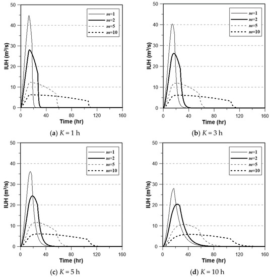 Figure 2 shows that both the effect of m and the storage coefficient on the Clark IUH are very clear. The effect of m can be easily found in Figure 2a, where a very small storage coefficient was applied. For a small m, that is, when the hillslope velocity is very high, the runoff peak flow is very high. As m becomes higher, the runoff peak flow becomes much lower. However, in all cases of m, the peak time seems to remain almost unchanged. In fact, this result is easily understandable, as in Figure 2a, the storage effect is almost negligible.