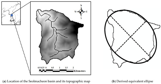 The method by Moussa (2003) [45] was applied to derive the equivalent ellipse representing the study basin. The method is based on the following four assumptions. First, the center of the ellipse coincides with the center of the given basin. Second, the major axis of the ellipse coincides with the major inertia axis of the basin. Third, the area of the ellipse should be the same as that of the basin. Fourth, the ratios between the maximum and minimum inertia moments in both the ellipse and the basin should be the same. Figure 3b shows the equivalent ellipse that was derived for the Seolmacheon basin. In this figure, the derived equivalent ellipse is overlapped by coinciding both the center and the major axes of the basin. As the geometrical shapes of the basin and derived ellipse match well, the derived equivalent ellipse is assumed to adequately represent the basin. The determined transverse and conjugate diameters of the ellipse are 3.6 and 3.0 km, respectively.