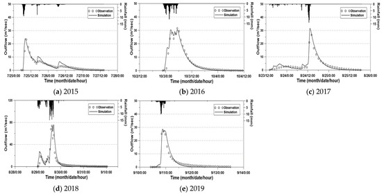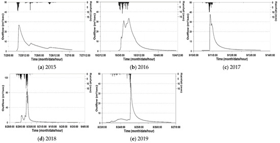 The areal-average rainfall data was estimated by applying the Thiessen polygon method, and the runoff data was derived by applying the rating curve to the water stage data measured at the exit of the basin. The cross-sectional mean channel velocity was also estimated using the runoff data and the cross-sectional area corresponding to the water stage. For example, for the rainfall event in 2018, the peak channel velocity was estimated to be 3.06 m/s, but for other rainfall events, the peak channel velocities were all less than 2.5 m/s. Figure 4 shows the rainfall–runoff data used in this study. Also, Table 2 summarizes the detailed information about these rainfall events.