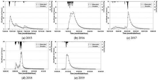 A total of five rainfall events were selected for analysis in this study. These rainfall events were the largest in each year from 2015 to 2019. Four events occurred during the wet summer season from July to September, and the fifth was in October during Typhoon Chaba. The biggest rainfall event among the five occurred on 28 August 2018, and lasted 39 h. The total rainfall amount was 315.1 mm, with a highest rainfall intensity of 53.0 mm/h being recorded on 29 August at 14:40. The smallest event occurred on 25 July 2015, and lasted 30 h. The total rainfall amount was 99.6 mm, and its highest intensity was 42.5 mm/h, recorded on 25 July at 07:30.