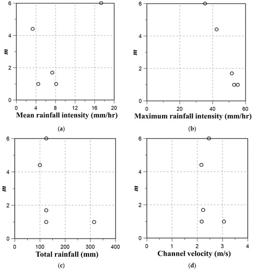 Change of the ratio (m) between the channel and the hillslope velocity with respect to (a) mean rainfall intensity, (b) maximum rainfall intensity, (c) total rainfall, and (d) channel velocity.