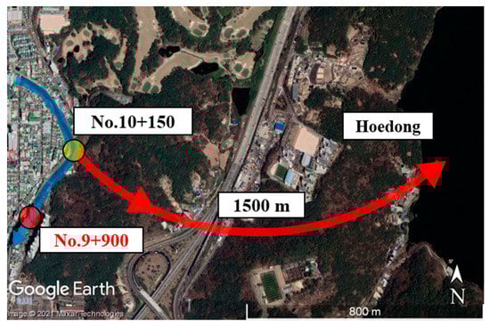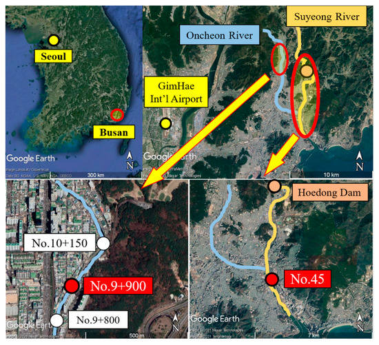 Figure 1 indicates the sections of the Oncheon and Suyeong river drainage basins that formed the focus of this study. Point No. 9+900 on the Oncheon River (bottom-left image) is one of the flood hazard points selected for this study; it is located 100 m upstream from point No. 9+800.