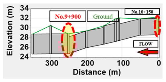 Figure 1. It shows that point No. 9+900 falls in an area with a gently sloping riverbed. Due to this profile and the lack capacity for rapid discharge during heavy rains, waterflow stagnates at this point, causing frequent flooding. Therefore, this station was selected as the flood hazard point on the Oncheon River.