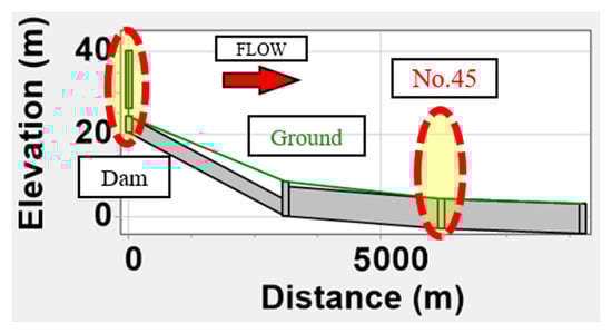 The opening and closing of floodgates was simulated by means of coding in EPA-SWMM. Since the purpose of this experiment was to reduce flood damage in the downstream areas by controlling the amount of discharge reaching them during abnormal rainfall, the following procedure was adopted. When the water level at flood hazard point No. 45 was low, the floodgate was opened, and water from the dam was discharged in advance. If the water level exceeded the designated flood level, the floodgate was closed. After the water at the flood hazard point drained to a certain level, the floodgate was opened again.