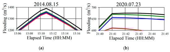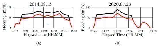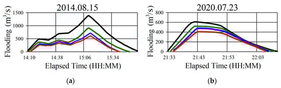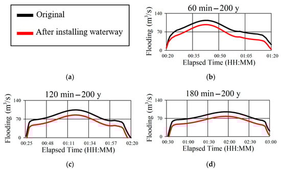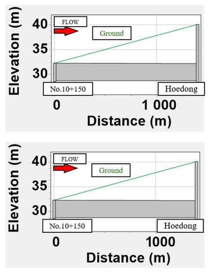 Figure 13 show graphs of the flood hazard point on the Oncheon River before and after the underground waterway is utilized. Taken together, these graphs indicate that, compared to the original model of the drainage basin, flooding started later and finished sooner when the Hoedong Dam’s capacity was augmented, floodgates were installed, and the underground waterway was used.