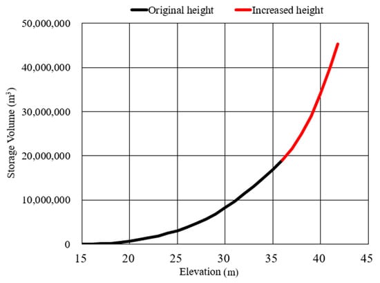 As the dam’s height was augmented, the additional storage quantity was estimated by means of the existing content curve, as shown in