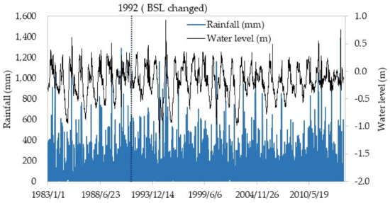 The water levels of Lake Biwa have been measured since 4 February 1874, and they were most recently measured by the Ministry of Land, Infrastructure, Transport, and Tourism (MLIT). We used daily water-level measurements of Lake Biwa from 1 January 1983 to 31 December 2013, obtained at 6:00 a.m. every day, representing the water height relative to the Lake Biwa baseline of ±0 m (BSL: Biwako standard level; +84.371 m) [32]. Until March 1992, the water level was based on the level at the Toriigawa observation point (Figure 1). After 1992, the average water level of five observation points (Katayama, Omizo, Hikone, Katata, and Mihogasaki; Figure 1) was used as the water level of Lake Biwa.