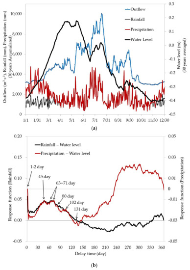 Figure 5. (a) Seasonal water level (averaged), outflow (accumulated), rainfall (accumulated), and precipitation (accumulated) for Lake Biwa and its catchment area, between 1983 and 2013. The average snow density (0.43 kg·m−3) was used to convert the snow depth change into snowfall (Table 1). The seasonal outflow traces the change in rainfall. (b) Response functions for the precipitation-water level. All data were standardized and compared with those in Figure 4. The resulting differences represent the effect of snow accumulation and snowmelt.