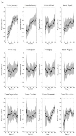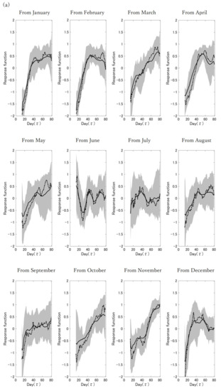 As for the response functions of the precipitation water level and precipitation water volume, they were calculated for 4 month periods from 1983 to 2013 (Figure 6a,b), and there were 24 results for each season (i.e., 4 months). For example, the figure heading “from January” represents the period from January to April. During the snowfall season in February, a positive peak appeared on day 45 (Figure 6a). The peak value of the response function between February and April (snowmelt season) during the 30 years was identified on day 45. During the snowmelt season, which started in March, two peaks appeared: one on days 28–31 and another on day 56 (Figure 6b). In April, a positive peak appeared on day 56 (Figure 6a,b). Meanwhile, in May, a positive peak appeared on approximately day 45 (Figure 6a). In June, two positive peaks appeared on approximately days 45 and 71. During July and August, a positive peak appeared on approximately day 45. As for September and November, a slight response was detected on approximately days 63–71 (Figure 6a). Lastly, in December and January, slight and weak positive responses were calculated on approximately days 45 and 63 (Figure 6a). In December (snowfall season), two peaks appeared: one on days 28–31 and another on day 56 (Figure 6b).