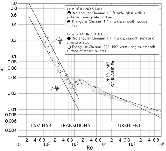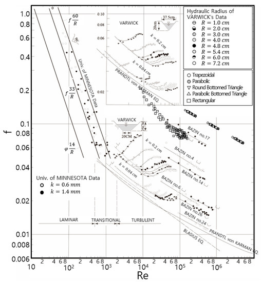 The experimental data from Bazin [3,4] in the late 1800s and Varwick [5] in the early 1900s showed relationships between the friction coefficient and Moody curves in a pipe flow. For the open-channel flow, similar results by Bazin and Varwick [5] were presented. These results showed that the flow characteristics in the laminar, the transition, and the turbulence flows were similar to those in the pipe flow.