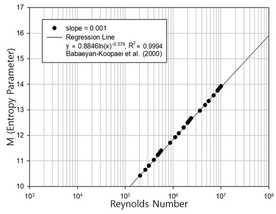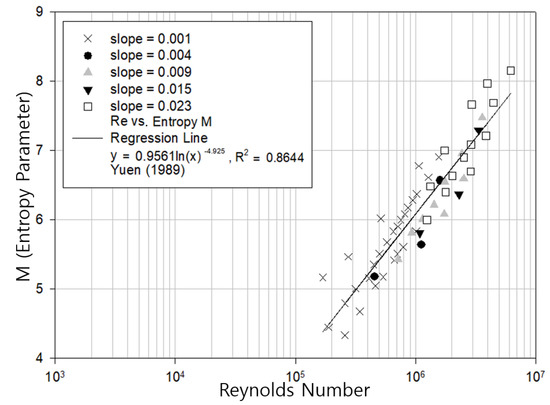 The entropy parameter M, defined in Section 4, was used in Equation (32) to calculate the coefficient of friction in an open-channel flow. The relationship between and is shown in Figure 5 and Figure 6.