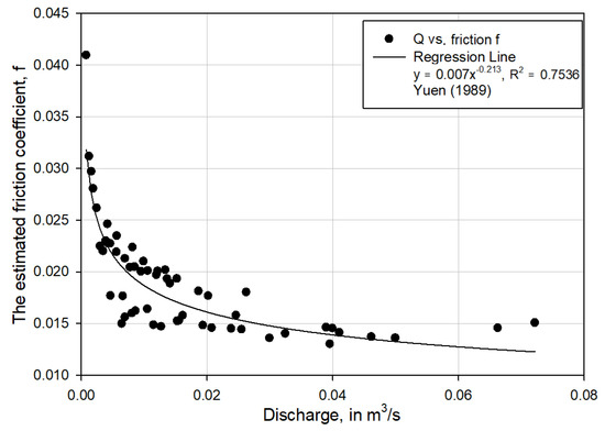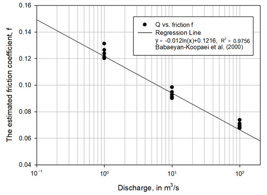 Equation (32) can be used to estimate the frictional loss coefficient (f) of the open-channel flow, which reflects its entropy. Equation (32) does not require the hydraulic factors used in the existing equations, such as shear velocity () or energy gradient (). In addition, the friction loss coefficient () can be expressed with only the average water velocity and the entropy , which are easy to obtain. In addition, there is also an advantage in that the energy gradient () can be estimated by using Equation (32).