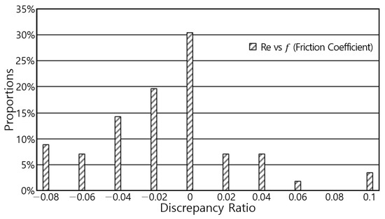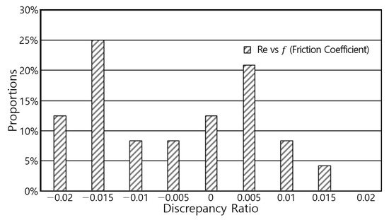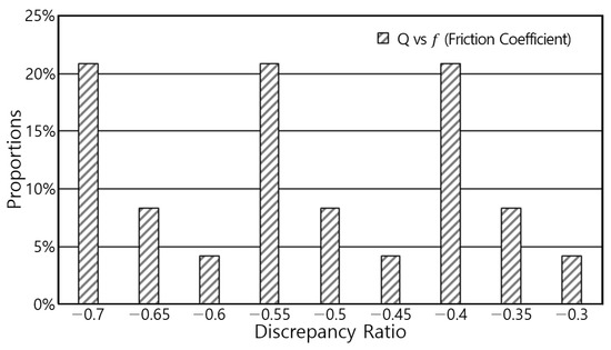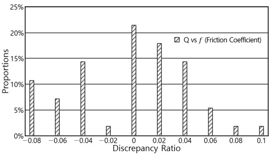 The coefficient of friction f in Figure 5 and Figure 6 shows the same trend as in Figure 1, where f tends to decrease as Re increases. In addition, in Figure 7 and Figure 8, the friction coefficient, , shows a tendency to decrease as the discharge increases. The discrepancy ratio is the error ratio between the measurement and calculated values, separated by a range. The proportions on the y-axis are the ratio of the total comparison quantity to the range of the x-axis. Figure 9, Figure 10, Figure 11 and Figure 12 show that the discrepancy ratio results of the proposed equation were all distributed near 0.