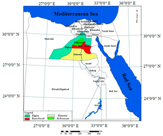 The current study is focused on the Middle Egypt region. It includes four governorates: Elgiza, Bani-Sweif, Al-Fayoum, and Elmenia, as shown in Figure 1. As a result of the lack of weather data for a long period, Giza governorate has been relied upon to represent Middle Egypt region, due to the existence of sufficient data for it. Its irrigated area is approximately 1.1 million feddan (1 fed. = 0.42 ha). In the summer season, cotton and maize are the main crops. In the winter season, wheat and berseem are the main crops.