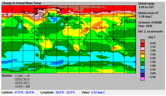 Change in annual mean temperature in 2050 at the regional level at latitude 27.5° N–30.0° N and longitude 30.0° E–32.5° E.