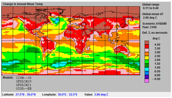 Change in annual mean temperature has been predicted in 2050 and 2100 using MAGICC/SCENGEN model under the conditions of the four selected models CCSM-30, GFDLCM20, GFDLCM21, and GISS-EH, as well as the scenario of A1BAIM (from SRES families). The A1B marker scenario (A1B-AIM) emissions increase through 2030, and subsequently decline to levels similar to those in 1990. After 2030, declining population levels, the introduction of modern management techniques, and the increased recycling result in a reduction in the waste which is sent to landfills, thus in a reduction in waste emissions. Emissions from biomass burning in A1B-AIM are assumed to decline steadily through the adoption of bio-recycling and other “no-waste” agricultural practices. Similarly, CH4 emissions from fossil fuel production and use grow through 2030 and subsequently decline as fossil fuel production falls (www.grida.no/climate/ipcc, accessed on 21 May 2021).