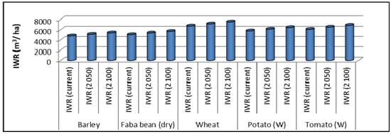 Results as presented in Figure 5 indicate average IWR over 30 years for some of the main winter crops in Middle Egypt under current and climate change conditions. Values of IWR under current conditions varied from 3792 to 5693 m3/ha for barley; 4060 to 5782 m3/ha for faba bean; 5462 to 8177 m3/ha for wheat; 4862 to 6650 m3/ha for potato; and 5107 to 6972 m3/ha for tomato. Increasing IWR is always due to high temperature, increased wind speed, or low relative humidity.