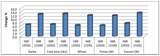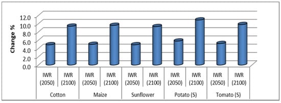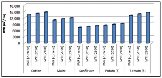 In 2100, they ranged from 12,367 to 17,273 m3/ha for cotton; 10,178 to 13,665 m3/ha for maize; 6842 to 9610 m3/ha for sunflower; 7690 to 11,513 m3/ha for potato; and 12,182 to 17,073 m3/ha for tomato. The change in percentage of IWR increased up to 5.8% in 2050 and 10.9% in 2100 (Figure 8).