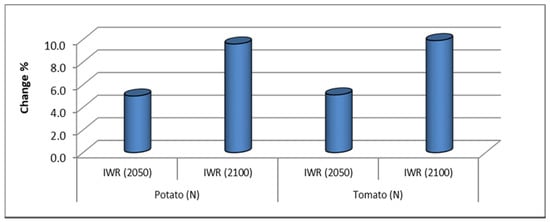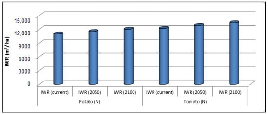 Values of IWR for Nili crops are presented in Figure 9. Results under current conditions revealed that seasonal IWR over three decades ranged from 9520 to 12,602 m3/ha for potato and 10,567 to 14,142 m3/ha for tomato. Concerning the values in 2050, the amounts varied from 9963 to 13,222 m3/ha for potato and 11,077 to 14,858 m3/ha for tomato. In 2100, the values ranged from 10,382 to 13,797 m3/ha for potato and 11,560 to 15,525 m3/ha for tomato. The change in percentage of IWR under climate change compared to current conditions (Figure 10) reached approximately +5% in 2050 and +10% in 2100.