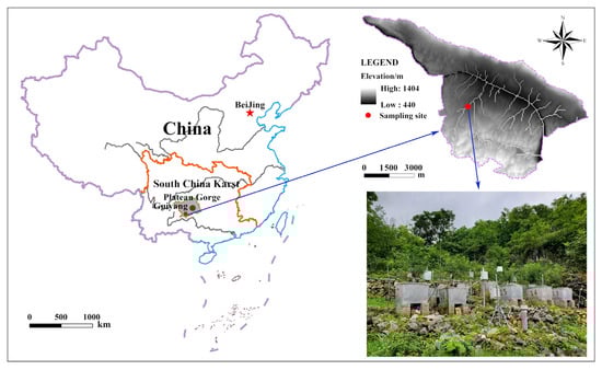 The study area is located at the Ecohydrological Observation Station of the State Engineering Technology Institute for Karst Desertification Control in the Beipanjiang catchment, Zhenfeng County, Guizhou Province, Southwest China (25°39′13″–25°41′00″ N, 105°36′30″–105°46′30″ E), which is in the Huajiang section of the Beipanjiang River basin, with a total area of approximately 26 km2. The karst area accounts for 87.92% of the total area, which is a typical type of the Karst Plateau Gorge landform [21] (Figure 1). The terrain is dominated by karst troughs and valleys, peak clusters and depressions. Carbonate rocks are exposed, and the terrain is undulating with elevations of 400–1100 m. The area has deep river valleys, and the groundwater level is deep, which makes it difficult to utilize the water resources. The climate type is a subtropical dry and hot valley climate, with a long-term average temperature of 18.4 °C, hot and humid summers and autumns, warm and dry winters and springs, and an uneven distribution of rainfall in different seasons. The annual rainfall is 1100 mm, mainly concentrated from May to October, and the rainy season precipitation accounts for 83% of the annual rainfall. The soil is mainly composed of limestone and marl as the parent material of soil formation, and the exposed amount of bedrock is as high as 70%. The surface rocks are exposed and broken, the rate of soil formation is slow, the soil layer is barren, and the soil water retention performance is poor. Karstification is strong, and rocky desertification landscapes such as karst gullies and fissures are widespread. The coverage rate of surface vegetation is low, the area of intense rocky desertification is large, and the soil erosion is serious and now on the verge of no soil flow. Affected by the special geomorphic pattern, the temperature is relatively high, the daily evaporation amount is large, the soil is thin, the water retention is poor, the drought tolerance is poor, and the abundant rainfall resources are difficult to efficiently utilize by plants. The primary vegetation in the small watershed has been destroyed, and the plants are mainly secondary forests, while the artificial economic forests are mainly drought resistant ZB, Hylocereus undatus (HU), Lonicera japonica (LJ), ST, and ZM. The evolution of rocky desertification patterns leads to difficulty in restoring degraded habitat vegetation and the poor structure of the remaining vegetation, which seriously restricts the comprehensive management of the ecological environment in this area.