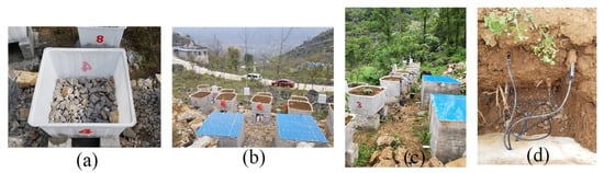 Design process of barrel planting experiment. Place gravel at the bottom of the experiment barrel (a), the same texture of soil was used for filling (b), the natural growth state of each vegetation (c), and the placement of 5TE θ sensor and MPS6 sensor (d).