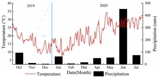 The experimental device was installed in October 2016. The barrel experiment was a regular trapezoid with a height of 65 cm and a volume of 500 L. The gravel was placed 5 cm from the bottom of the barrel, and a small hole was provided at the bottom to ensure the permeability of the device to prevent root rot during extreme rainfall events (Figure 2a). The same texture of soil was used for filling (Figure 2b). The fertilization and ploughing of planted ZB and ST occurred in the same period and ploughing and fertilization were generally not used in the latter period. ZM was planted in the spring of the following year, and ZM was fertilized and ploughed once a year. AL was abandoned naturally without tillage and fertilization. Three control devices were set for each vegetation type. From October 2016 to June 2019, each barrel was planted in a state of natural growth, and there was no other artificial disturbance except fertilization and ploughing (Figure 2c). For each vegetation type, we selected a group of barrel equipment with good growth conditions to collect samples of soil physical properties and install monitoring instruments. In June 2019, a ring knife (5 cm) was used to collect undisturbed soil within 0–15 cm, 15–30 cm, and 30–45 cm from the top to the bottom of each experimental bucket. Soil bulk density (ρb), field water holding capacity (FC), the total porosity (TP), and capillary porosity (CP) were measured using the ring knife method. Saturated water conductivity (Ks) was measured using the constant head method, and soil noncapillary porosity (NCP) was calculated by the difference of TP and CP [23]. The characteristics of these basic soil properties are shown in Table 1. At the same time, a 5TE θ sensor, MPS6 water potential sensor (Meter, USA), and data collector (EM50, USA) were installed at distances 10–15 cm from both ends of vegetation roots and 7.5 cm, 22.5 cm and 37.5 cm vertically downward from the horizontal plane (Figure 2d). Each layer (0–15 cm, 15–30 cm, 30–45 cm) was monitored to determine θ and . Using the EM50 data collector (Decagon, USA), the data indexes θ and were dynamically collected at a frequency of 30 min/time. The monitoring data used in this paper were from 1 October 2019 to 24 July 2020. A meteorological station (Meter, USA) was set 15 m from the experimental sample site. The main monitoring indexes of meteorological station included rainfall, air temperature. The data collection frequency was 30 min/time. The dynamic monthly changes in all indicators are shown in Figure 3. The rainfall was mainly concentrated in October 2019, June 2020, and July 2020.