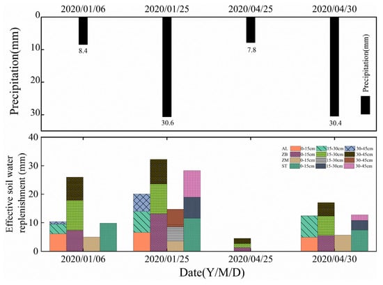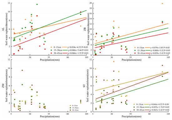 The response of θ of various vegetation types to precipitation is a complex process that is affected by factors such as the scale of rainfall events, rainfall intensity, previous drought interval, and soil texture. Additionally, vegetation types play an important role in the process of rainfall redistribution and evapotranspiration [33,34,35]. Precipitation is one of the important agricultural water replenishment sources in karst areas. As shown in Figure 10, the effective rainfall recharge of the AL, ZB, and ST soil profiles at different depths was positively correlated with rainfall, indicating that rainfall had a direct impact on the soil water replenishment of these three types of vegetation. The replenishment rate of AL was the highest, mainly due to the relatively strong surface permeability of AL and the even distribution of vegetation roots in the shallow layer, which was conducive to sufficient precipitation infiltration. The amount of soil replenishment was affected by the rainfall process, soil evaporation and plant transpiration. The surface layer was highly permeable, which accelerated the infiltration of precipitation and at the same time promoted the evaporation of the soil, accelerated the loss of θ, and reduced the water retention performance of the soil. Therefore, the combination of soil properties and overlying vegetation led AL to be significantly affected by rainfall and to exhibit a weaker water storage capacity. With increasing depth, the effective replenishment amount of ZB decreased gradually, and the root absorption was strong. The effective replenishment of rainfall was the largest, and the recharge efficiency was the highest, but the duration of rainfall was short. The effective amount of replenishment in ST was 0–15 cm > 30–45 cm > 15–30 cm, which was consistent with the characteristics of the distribution area of the main ST root water consumption in ST. The effective replenishment of each layer in ZM did not show a good linear relationship with rainfall, which might have been due to the relatively weak permeability of ZM. In the process of rainfall, ZM exhibited a strong hysteresis and was not sensitive to rainfall response. Compared with the other three vegetation types, the rainfall replenishment efficiency of ZM was the lowest.