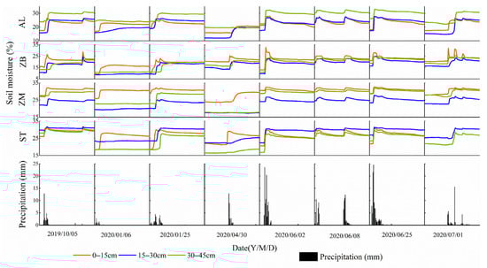 Daily soil moisture content dynamics changes in profiles of AL, ZB, ZM, ST from 1 October 2019 to 24 July 2020.