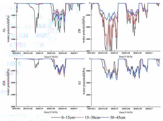 The dynamic changes in in different vegetation types were shown in Figure 8, and its seasonal changes were significant. The profiles of ZB and ST experienced three long-lasting water stresses (CP, SP2). The 15–45 cm layer of both AL and ZM had one long-lasting moisture stress restriction during CP2, and the 0–15 cm had two long-lasting moisture stress restrictions during CP. Entering CP1, the of the soil layer in ZM gradually decreased, the change at 0–15 cm was the largest, while that at 15–45 cm showed a trend of (30–45 cm) < (15–30 cm), and the magnitude was relatively low. Entering CP2, the change range of was −1369.0 kPa~−142.7 kPa lower than that during CP1, indicating that the moisture demand of ZM increased in CP2. The variation trend of the AL was consistent with that in ZM, but the variation range of the in AL was larger than that in ZM, indicating that the amount of moisture available for plant growth and absorption was lower. ZB may have experienced 3 long-lasting moisture stress restrictions and 3 phase change trends that were the same: (30–45 cm) > (15–30 cm) > (0–15 cm). In CP1, the range of (0–15 cm) was −6514.5 kPa~−1084.3 kPa, the range of (15–30 cm) was −3569.0 kPa~−986.7 kPa, and the range of (30–45 cm) was −1526.3 kPa~−589.5 kPa. In CP2, the of these layers increased by 53.2%, 48.8% and 34.4%, respectively. The third moisture shortage period (10 May 2020 to 1 May 2020) lasted for a short time, and was the highest in each dry period. During the three stages of relative moisture shortage, the profile of ZB fluctuated greatly, but that of θ remained in a relatively stable state with a fluctuation range of 8–12%. Only in the third stage did θ (0–15 cm) show a short and significant increase. The change trend of in ST was similar to that of ZB and could be divided into 3 main water shortage stages. The in ST was second only to that in ZM. In the first drought stage, was expressed as (30–45 cm) > (15–30 cm), and the (0–15 cm) fluctuation was large. In the absence of rainfall, the value of (0–15 cm) was somewhere in between those in the other two layers. After rainfall recharged the soil, the surface increased rapidly and was higher than that in the 15–45 cm layer for a period of time. However, in the two subsequent drought stages, the surface was relatively high, and the change trends of the 15–30 cm and 30–45 cm soil layers were consistent and close. In the first two drought stages, the changes in the ST soil layers were not significant. Compared with the first drought stage, the of each layer increased by 13.5%, −17.9% and 5.4% in the second drought stage, respectively. In the dry period of ST, the (15–30 cm) and (30–45 cm) were similar, but with the 15–30 cm soil moisture generally higher than that in the 0–15 cm and 30–45 cm layers.