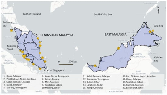 Malaysia is located near the equator in Southeast Asia on latitude 2°30′ N and longitude 112°30′ E, bordering Thailand, Singapore, Philippines, Indonesia, and Brunei. The coastlines face seven major water bodies: the Andaman Sea, the Straits of Malacca, the Straits of Singapore, the South China Sea, the Gulf of Thailand, the Celebes Sea, and the Sulu Sea. Malaysia comprises fourteen states in two regions; Peninsular or West Malaysia (PM) and East Malaysia (EM), separated by the South China Sea, as presented in Figure 1. PM consists of twelve states and the remaining two states are in EM (not including one federal territory of Labuan Island). Malaysia’s total land area is approximately 330,803 km2, of which 99.63% is land and the remaining 0.37% is inland water area. Whereas the total sea area is almost twice the size of total land area at 614,159 km2 and the size of EEZ alone is 453,186 km2 [].