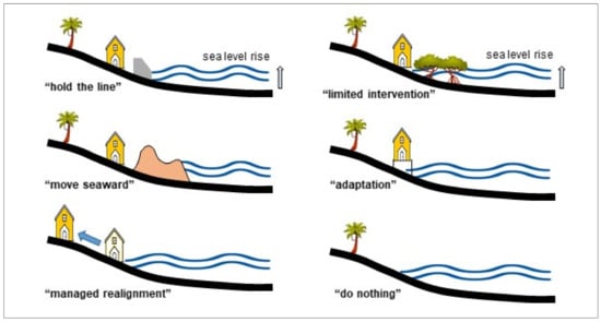 The earliest study by the Intergovernmental Panel on Climate Change (IPCC): Coastal Management Subgroup and Response Strategies Working Group proposed three approaches for adaptation to sea-level rise, namely protection, retreat, and accommodation []. Discussions on available methods evolved and based on a recent management guide for disaster risk reduction in the European coastal zone, five different strategies are adopted [,]. In terms of coastal risk management in Malaysia, these options can be suited for both coastal erosion defense and sea-level rise adaptation. Figure 2 proposes six management strategies, which were also adopted from various studies by [,,].
