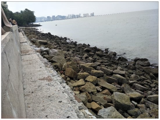 Rock revetment is designed as less permeable seawalls with a sloping mount and is constructed of large boulders interlocked together to dissipate wave energy. Both seawall and rock revetment have undeniably affected the natural coastal landscape scenery and tourists cannot easily reach the seawater, resulting in the reduction of visitors and income to the residents [].