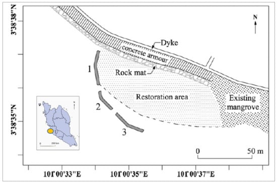 Kamali et al. [] suggested that the mudflat shore along the west coast of PM is mostly protected by a combination of rock bunds and breakwater for protection from erosion during high tide events to overcome this issue. For example, the coast of Morib, Kuala Langat, Selangor incorporates hard structure and soft engineering techniques, which comprise earth bund as major protection and geotextile tubes to provide a suitable environment for mangrove replanting. The sheltered area provides calmer hydrodynamic conditions and augments sediment deposition suitable for mangrove replanting. This natural “limited intervention” strategy in preserving mangrove forests effectively reduces wave impact [].