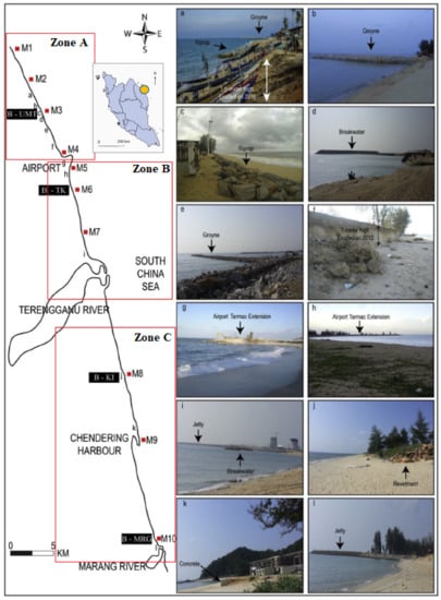 Coastal protection structures along Kuala Terengganu—Marang beach. (Erosion at locations in subfigure a–g, i and j; accretion at subfigure g, h and l; no changes at subfigure e and k []. ‘Reprinted with permission from [], 2018; Elsevier. License Number 5071150332416, Date 17 May 2021’.
