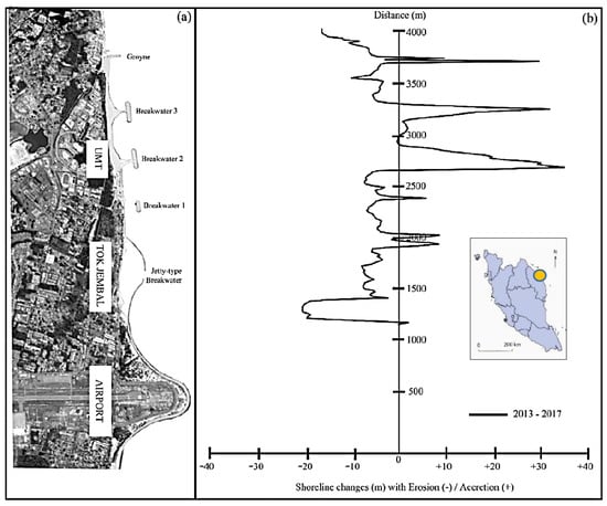 Shoreline changes along Kuala Nerus beach with (a) the current shoreline in 2017 and (b) erosion and accretion rates between 2013 and 2017 []. ‘Reproduced from [] 2020; JSSM UMT.’