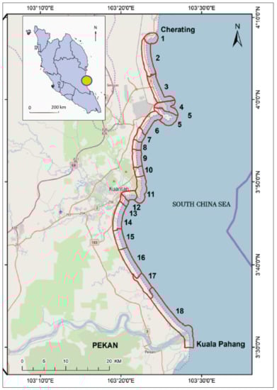 Beach erosion is defined as long-term sediment loss within coastal zones due to changes in a hydrodynamic pattern such as wind, wave, and current [,]. In the natural coastal cycle, sediments are transported and distributed by these hydrodynamic forces along the coast, providing material for dunes, beaches, and marshes []. Even though anthropogenic activities mostly drive erosion, however, with a combination of natural forces; the impacts are exacerbated by climate change []. In Malaysia, the coastal processes are greatly influenced by the East Asian monsoon system that brings a great intensity of the related physical phenomena associated with waves, current velocities, winds, and a high rainfall frequency [], subsequently impacting the cycle of beach erosion and accretion.