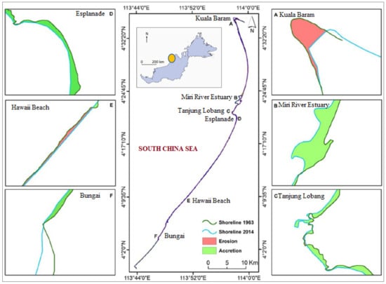 Shoreline changes between 1963 and 2014 in Miri, Sarawak (A. Baram River Estuary, B. Miri River Estuary, C. Tanjong Lobang Beach, D. Esplanade beach, E. Hawaii beach and F. Bungai Beach) []. ‘Reprinted with permission from [], 2019; Elsevier. License Number 5071150332416, Date 17 May 2021’.