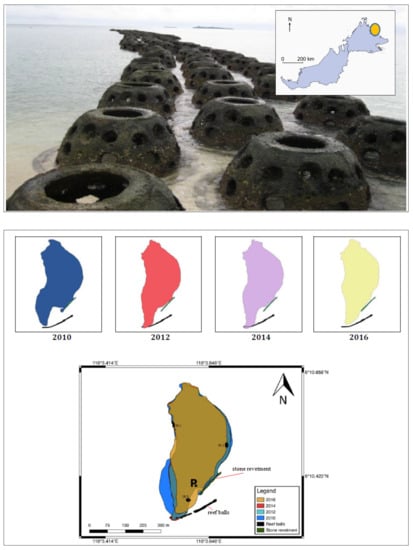 Another example, reef ball structures were deployed by Sabah Park as a state government agency in 2005 at Selingan Island, Sandakan, Sabah, Malaysia. The 290 sets of this submerged structure that protects the shoreline were arranged into three rows at the southern part of the island to increase the stability as shown in Figure 11 As can be seen, the size of Selingan Island has slightly decreased from 9.56 to 8.56 hectares from 2010 to 2016. The east and west mid-sides of the shoreline were eroded, however, the southern tip island experienced sand deposition between the reef balls and stone revetment. It can be suggested that the presence of reef balls as coastline protection successfully increased the sand deposition processes due to the reduction of attenuation waves and local current speed []. Saleh et al. [] also mentioned that the installation of reef balls improved the formation of the tombolo, trapping the sediment and providing more nesting areas for turtles.