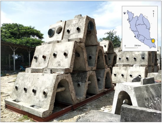 Novel prefabricated concrete structures that were stacked together to form a simple trapezoidal arrangement as a single unit, as shown in Figure 12, were studied by Desa et al. []. This submerged structure was installed approximately 150 m from the shoreline of Pulau Tinggi, Johor, Malaysia. The experimental result indicated structural friction to wave motion, where the coefficient of transmission Ct values tend to decrease with the increment value of relative wave period, incident wave height, and relative narrow crest width []. The function of this structure is for wave breaking protection [] with additional functions to restore the coral growth and fish ecosystem. The prototype weighed 371.38 kg with a density of 2400 kg/m3, which resulted in high cost during transportation and installation. After three years of deployment, the coral reef colony rapidly grew from 8.66% to 29.75% from the whole surface of the structure [].