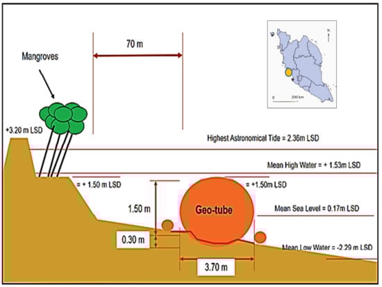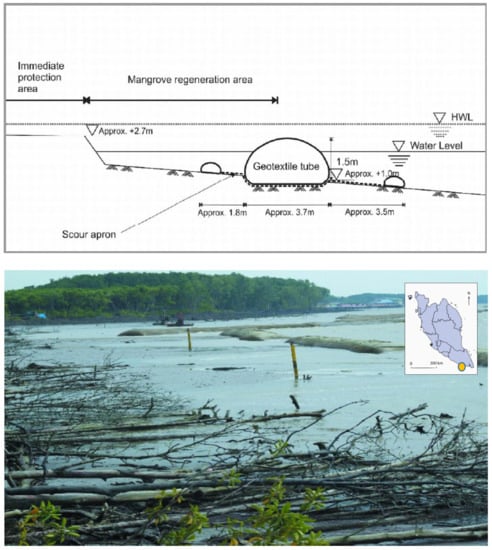 Johor is a state in the southern region of Peninsular Malaysia that has an effect of hydrodynamics forces, sediment supply, geomorphology, and antecedent topography with close relations with current and wave from Malacca and Singapore Straits. Tanjung Piai beach, Johor is located at the most southern tip of Asia is classified under Category 1 coastal erosion, where mangrove forest is critically eroded. The muddy coast is also facing oil spill incidents, which caused degradation of mangrove and eventually increased the erosion process. Protection structures, such as geotextile tubes, sea wall, revetment, and offshore breakwater, are implemented in phases []. Geotubes of over 1.5 km long with the cost of USD 0.7 million were built between 2003 and 2006 along the Tanjung Piai beach. However, due to the soft soil at the seafloor, the structure sank into the mudflat and lost its capability to protect the coast. It was also observed that offshore breakwaters have successfully safeguarded the mangrove forest from further deterioration. The structures led to sediment accumulation at the up-drift side and corresponding minor erosion on the downdrift side. The reduction of current speed and wave height behind the structures allowed calmer conditions for mangrove growth. Besides, the function of the geotextile tube as a breakwater to minimize the scouring effect at the toe and mud floor is forecasted to occur due to turbulence generated by wave energy reflection at Tanjung Piai, Johor. Tan et al. [] also observed that the breakwaters created a calmer water surface at the shoreward side. Figure 15 shows the schematic diagram and photo of the geotubes at Tanjung Piai Johor. It has obtained substrate build-up significantly close to the shoreline.