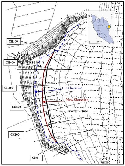 Geotube as submerged dykes in Teluk Kalong, Terangganu []. ‘Reproduced with permission from Geotextile tubes as submerged dykes for shoreline management in Malaysia [], 2012; published by Elsevier, License Number 5071151338498, Date 17 May 2021’.