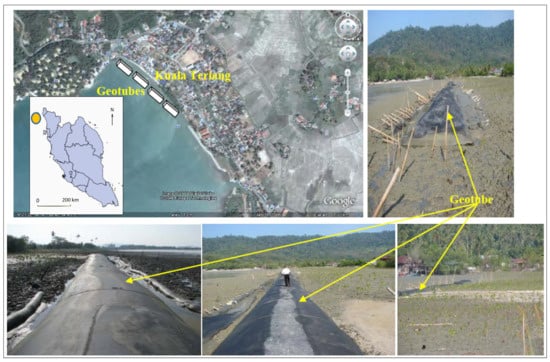 A study on geotextile tubes as coastline protection was conducted by Sulaiman et al. []. Four geotextile tubes were used with a dimension of 1.8 m (h) × 3.7 m (w) × 50 m (L), stretching 200 m and hydraulically filled with slurry sand. These breakwaters were placed at approximately 70 m from the coastline of Muara Marine Park Resort in Sungai Haji Dorani, Sungai Besar, Selangor as shown in Figure 13. Three different species of mangrove seedlings, namely Rhizophora apiculate, R. mucronata, and Avicennia alba, were planted by using three innovative planting techniques. It showed that only Rhizophora apiculate and R. mucronata species had the highest survival rate of more than 90%. However, after five years, only 34% of the 8857 planted mangroves survived. It was due to a strong current, high waves, and soft mudflat, which resulted in sweeping and uprooting of the seedlings [].