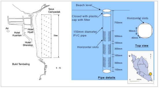 - Tan, K.S.; Hisham, N.; Ghazali, M.; Ong, H.L. Rehabilitation of the Beach at Teluk Cempedak, Pahang, Using Pressure Equalisation Modules (PEM) System; The Institution of Engineers: Petaling Jaya, Malaysia, 2009; Available online: http://dspace.unimap.edu.my/bitstream/handle/123456789/15468/Feature0809.pdf?sequence=1&isAllowed=y (accessed on 19 June 2021).