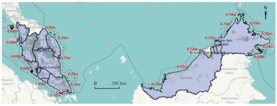 PM is dominated by semidiurnal and mixed (dominant semidiurnal) tides. Diurnal tides are dominant along the east coast of the states of Kelantan, Terengganu, Pahang, and Johor []. Whereas two types of tides characterize the west coast states of Kedah, Perak, Penang, and Selangor: semidiurnal and mixed tide prevailing semidiurnal []. On the other hand, both diurnal and semidiurnal tides dominate almost equally in Sabah and Sarawak’s coastal EM. There is no diurnal tide available in Malaysia. Based on tidal station records, the highest tidal range points are in Port Klang, PM, and Sejingkat, EM [].