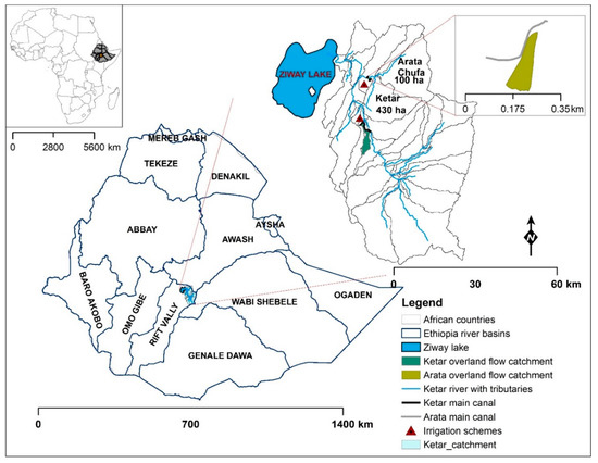 Location of the Arata-Chufa and Ketar irrigation schemes and the catchments contributing overland sediment inflow.