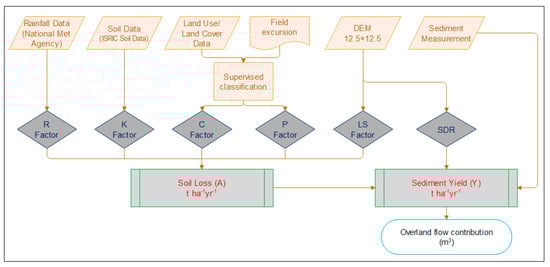 Since our study area is characterized by data scarcity, we modeled soil erosion using the revised universal soil loss equation (RUSLE) developed by Wishmeier and Smith [21] coupled with GIS and remote sensing. Due to its simplicity, RUSLE has been widely applied globally and proven to be of value in the Ethiopian highlands [19,22]. Figure 3 presents our conceptual framework, in which RUSLE was used to identify the main upland sediment sources and to quantify soil loss and sediment yield in the main canals of the schemes under investigation from overland flow sources.