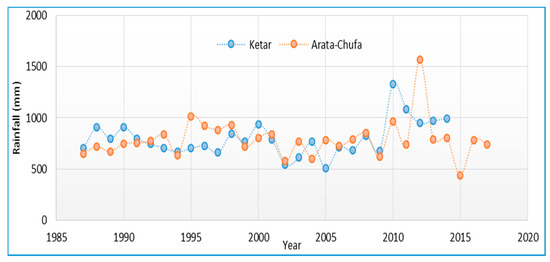 For the Arata-Chufa scheme, we used mean annual precipitation for 1987–2017 from Arata station records (Figure 4). For the Ketar scheme, nine meteorological stations were nearby. Rainfall interpolation mapping indicated that only the Ketar-Genet station was sufficiently representative of the rainfall characteristics of the catchment of interest. We therefore computed the rainfall erosivity factor using the mean annual precipitation data from the Ketar-Genet station for 1978–2014 (Figure 4).